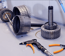 Cutie viteze DSG Skoda Octavia, Skoda Superb 7 trepte (cod 0AM) cu ambreiaj uscat. Ambreiajul dublu necesita un reglaj special altfel se intampla ca in poza, sa fie distrus de saiba de reglaj care pleaca din locasul ei. In prima poza este o vedere dinspre cutie a unitatii de comanda (mecatronic).